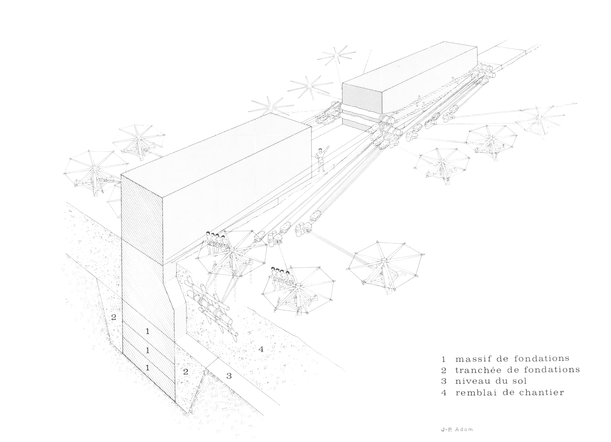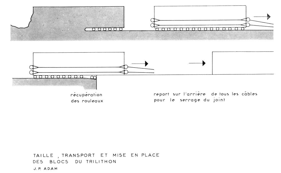 Adam reconstruyó el proceso de transporte a partir de marcas visibles en la cantera y del relieve natural del terreno. Según su modelo, los bloques eran extraídos parcialmente de la roca madre, colocados sobre rodillos de madera y arrastrados mediante cabrestantes sincronizados (grandes tambores giratorios movidos por cuadrillas de operarios). El desplazamiento se controlaba con polipastos y cuerdas, permitiendo aplicar una tracción constante sin riesgo de pérdida de control.